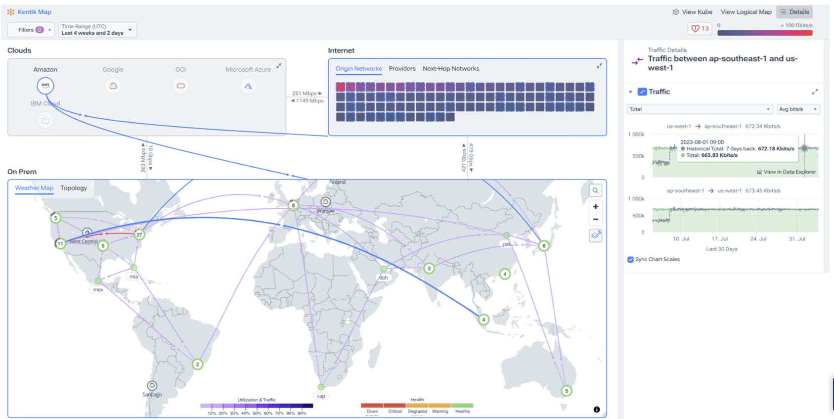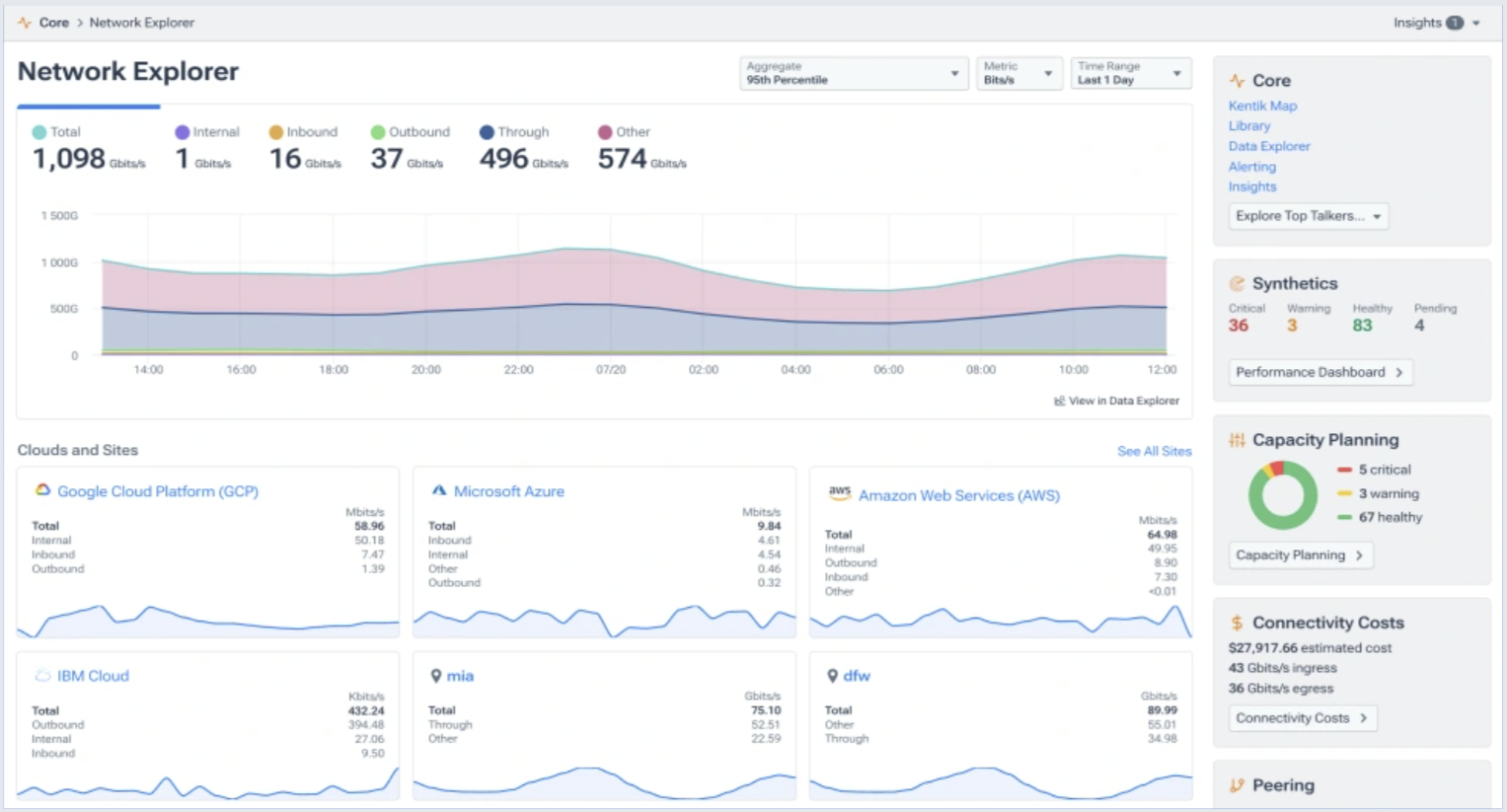 - Multi-Cloud performance: Provides an overview of the performance of data traffic to and from, between and within hybrid and multi-clouds.