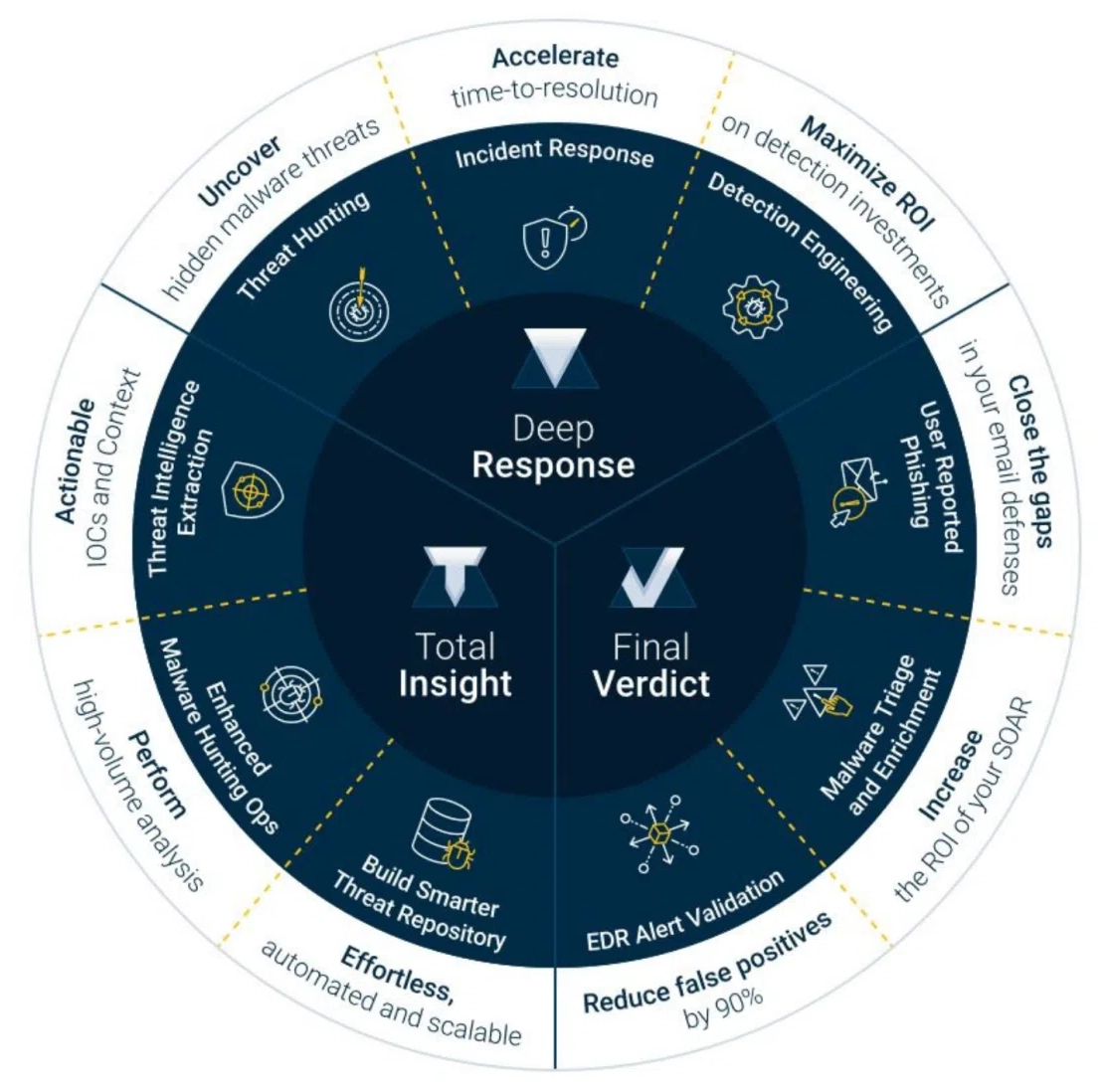 DeepResponse liefert detaillierte Berichte ohne unnötige Informationen, die für die Eindämmung und Reaktion auf unbekannte, gezielte oder ausgeklügelte Datei- und URL-basierte Bedrohungen erforderlich sind. Mit dem Fokus auf Geschwindigkeit und Effizienz wurde VMRay DeepResponse entwickelt, um die Reaktionszeiten auf Vorfälle zu verkürzen und den ROI von zeitintensiven Bedrohungsanalyse-Prozessen zu verbessern.
